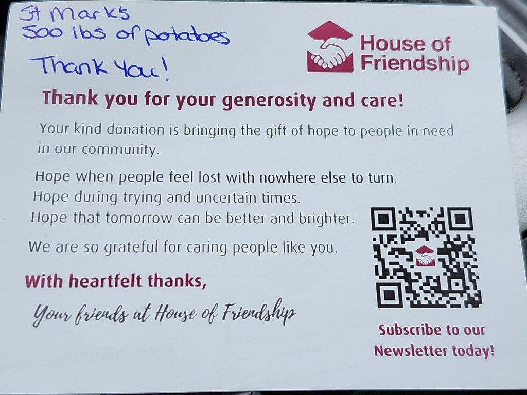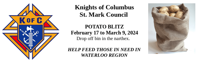 Once again we gave the St. Mark’s Parishioners the opportunity to contribute potatoes for the House of Friendship and contribute they did. We collected over 500 lbs of potatoes for the House of Friendship. In the last six years we have collected over 2 tons of potatoes to help feed our neighbors in the Kitchener area. Great work!