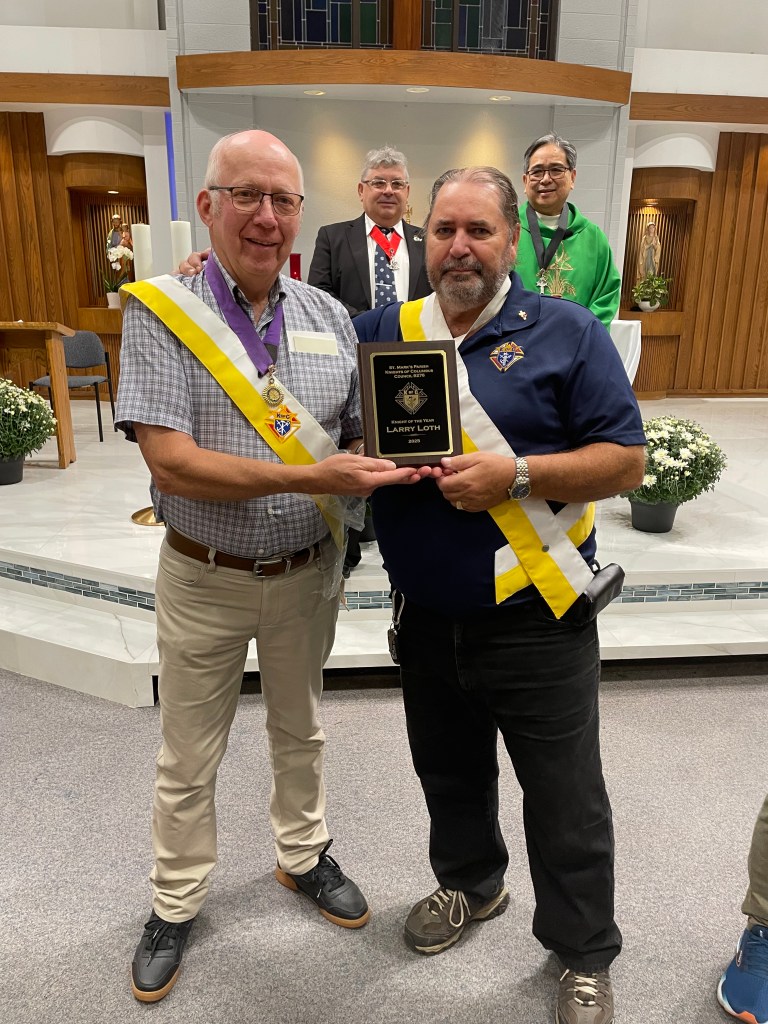 Patrick Drohan and Larry Loth presented with Knight of the Year award. Mike Szabo (DD) and Fr. Roque Concepcion (Chaplain) in back. Larry was recognized for his outstanding service in fund raising and membership morale boosting, organizing a trivia “knight” for us and running the annual Poinsettia Sale during Christmas.
