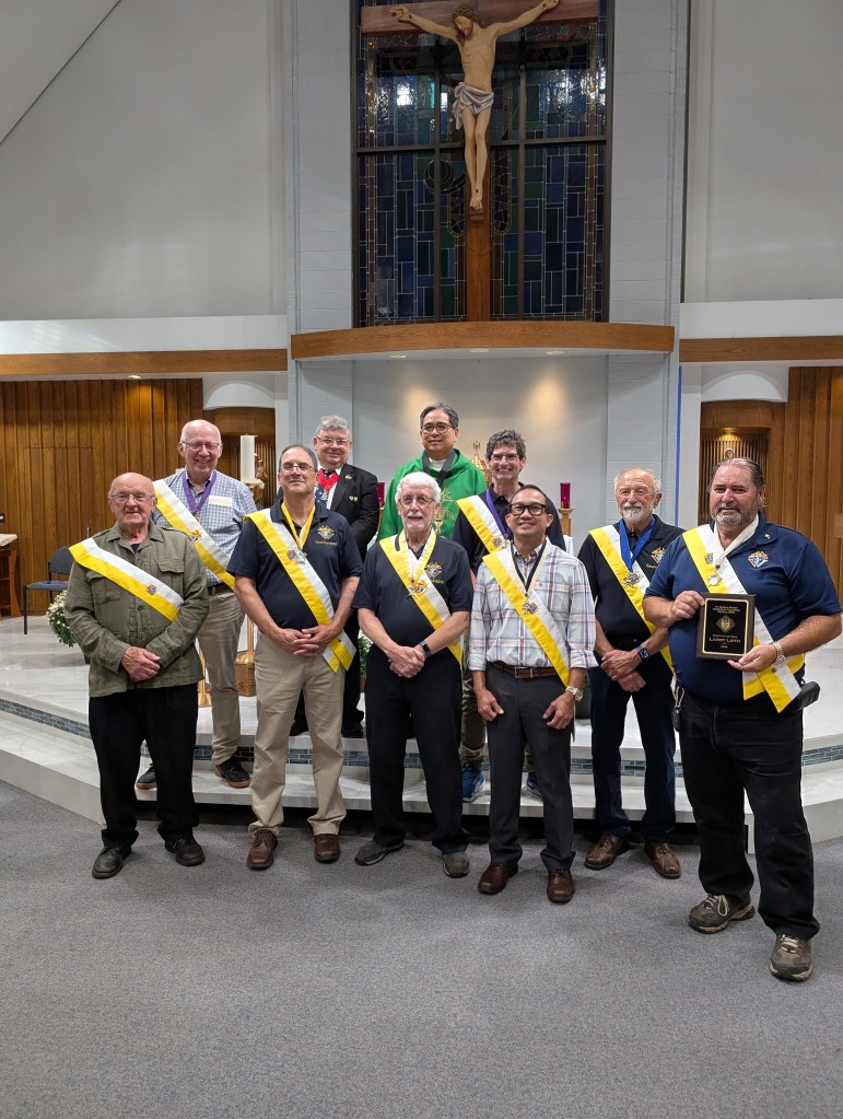 Executive and Attendees at the 2025/2026 Installation of Officers, with our honored Knight of the Year, Larry Loth. (from left to right, back row) Patrick Drohan (DGK), Mike Szabo (DD), Fr. Roque Concepcion (Chaplain), Mike Serres (GK) (from left to right, front row) William Sawarna (HL), Jim Flanigan (FS), Paul Enticott (Recorder), Charles Palafox (Chancelor), Larry Loth (OG and Knight of the Year recipient)