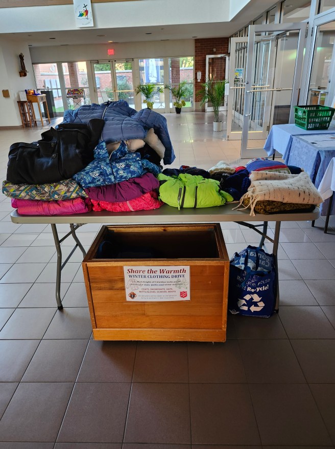 Once again, Council 9276 is “Sharing the Warmth”. During the months of October and November, 2025, the parishioners of St. Mark Parish are generously donating winter clothing for delivery to the Salvation Army. On October 9, Brother Paul Enticott made our first delivery, with all the generous donations made to date.. We know that there will be more to follow.